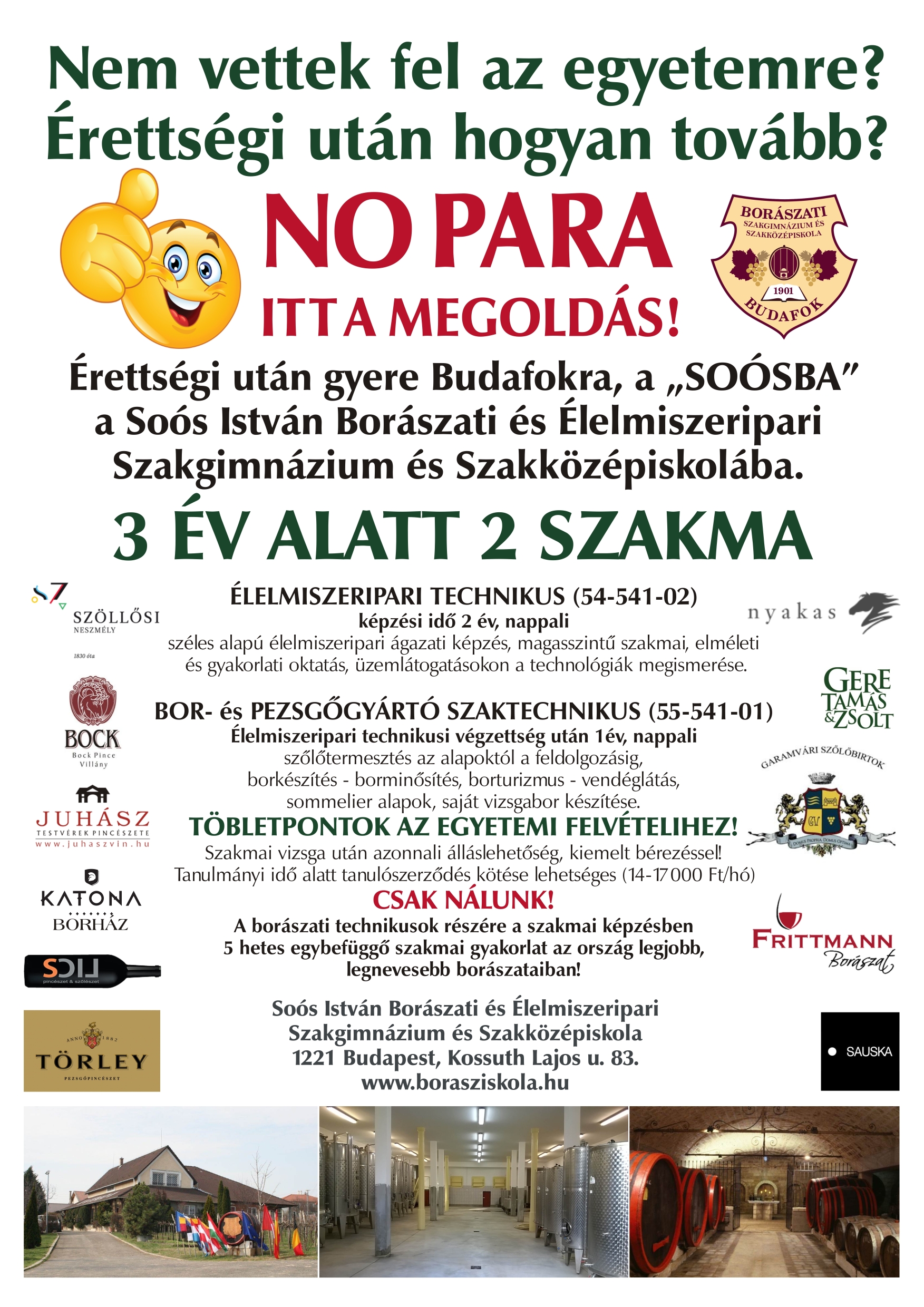 Van élet a sikertelen főiskolai, egyetemi felvételi után is! Iskolánk érettségivel rendelkező tanulóknak továbbtanulási lehetőséget kínál, két éves esti tagozaton "bor és pezsgőgyártó technikus" SzJ szerinti szakmai területen. További információk a "KÉPZÉSEINK" menüpontban olvashatók... "